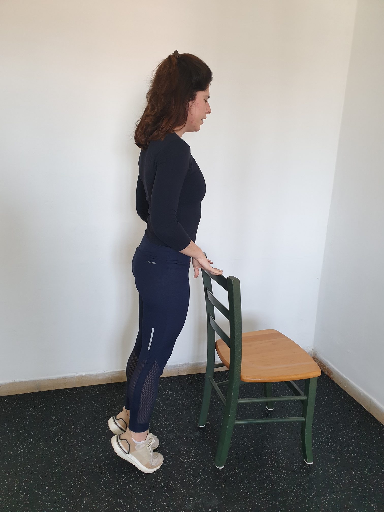 עימדו ליד כיסא או השיש במטבח ועלו קצות האצבעות למקסימום גובה, רדו בצורה מבוקרת לרצפה. נסו לא להחזיק בשום דבר, אלא אם יש צורך בכך.