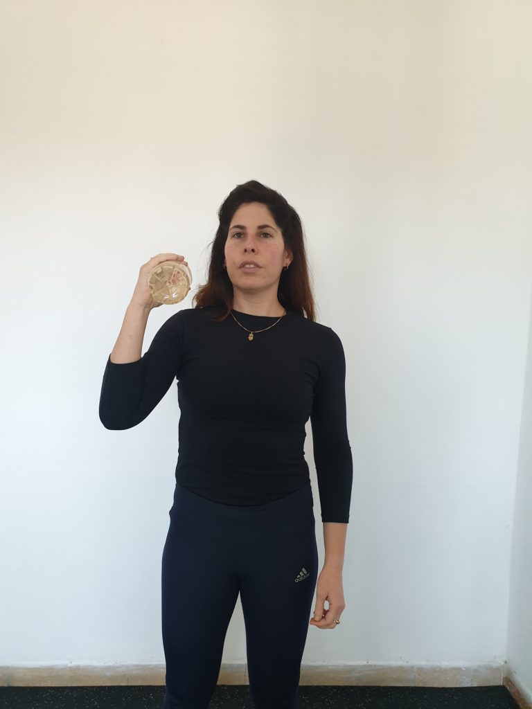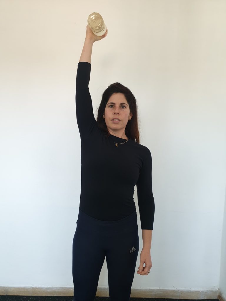 עימדו ישר ומי שלא יכול אז ניתן בישיבה על כיסא. הרימו יד ישרה כלפי התקרה והורידו חזרה לגובה בו כף היד בגובה הכתף. אם טווח התנועה מלא ולא כאוב, רצוי להחזיק משקולת בזמן ביצוע התרגיל. המשקל יכול להיות בקבוק מים או שקית אורז. נסו לעבוד עם משקל שבו אתם מצליחים לעשות לפחות 8-10 חזרות, כלומר מאמץ, אבל לא גדול מדי.